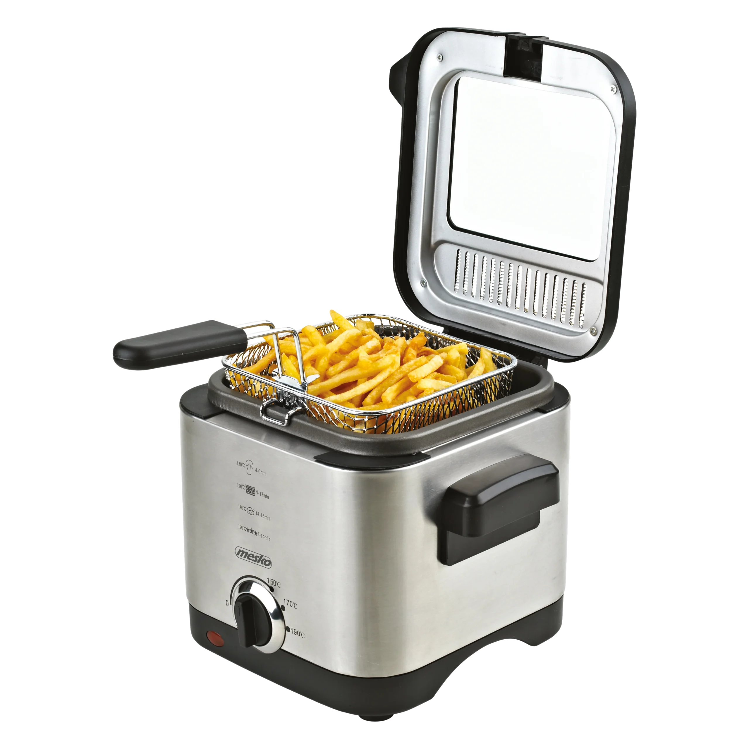 • Freidora Acero Inox. 900w 1’5l Tapa Transparente Luz Control Cesta Elevable Asa Plegable