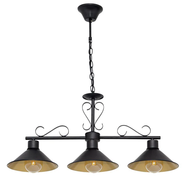Lámpara Colgante Azalea 3xE27 Negro/Oro. Transforma tu salón en un espacio acogedor y elegante con este colgante de tres luces que fusiona el encanto rústico con toques sofisticados. Su diseño lineal con pantallas metálicas en negro y oro interior no solo ilumina con calidez, sino que eleva la decoración de casas de campo o hogares rústicos, creando ambientes luminosos y acogedores. Imagina cenas familiares bajo su luz dorada, o tardes relajadas en un salón que resalta la elegancia vintage con bombillas de filamento. Integra palabras clave como ‘lámpara colgante rústica negra oro’, ‘colgante para salón grande’ y ‘iluminación interior metálica’. La calidad de Abrila asegura durabilidad y estilo, disponible exclusivamente en LUZGURU para que decores con confianza.