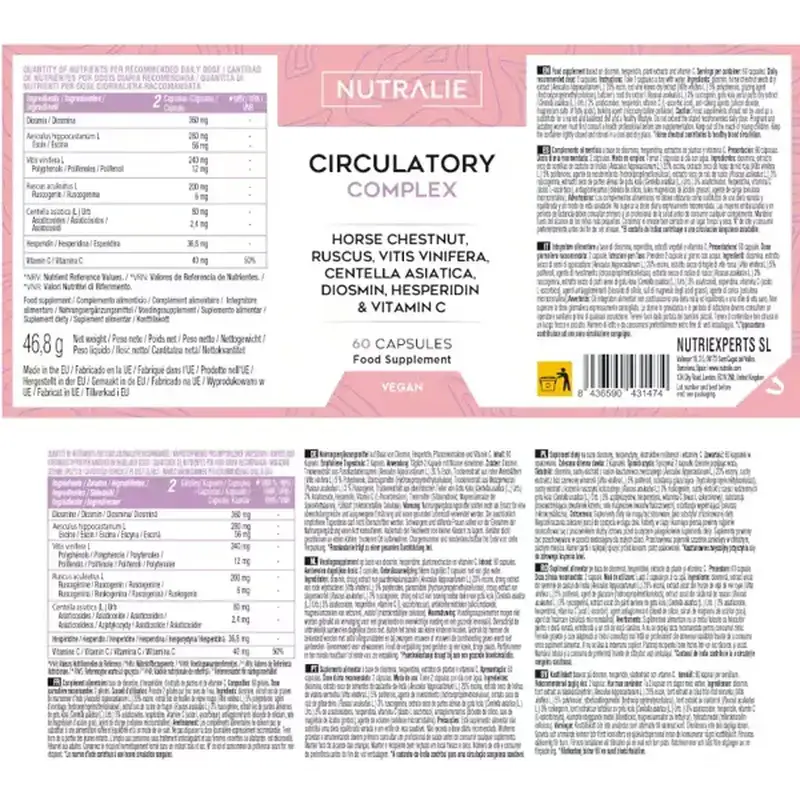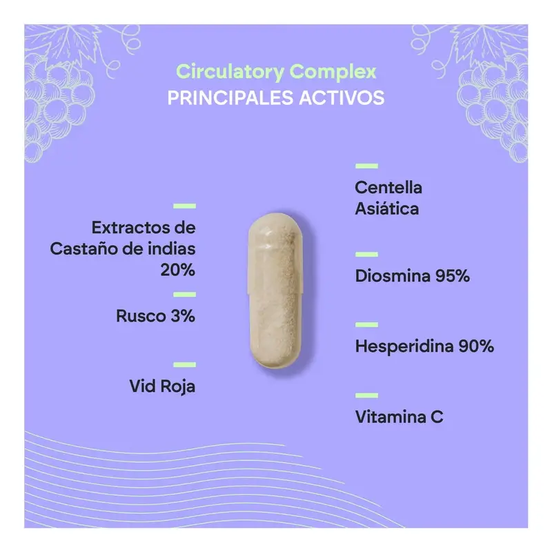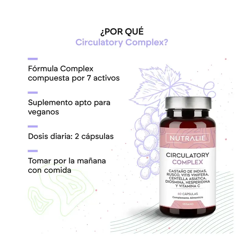 Circulatory Complex de Nutralie es un suplemento alimenticio formulado a base de Diosmina y Hesperidina, Vid Roja, Castaño de Indias, Centella asiática, Rusco y Vitamina C, ingredientes perfectos que ayudan a mejorar la circulación de las piernas, las varices, la retención de líquidos y las piernas cansadas. Por otro lado, la Vitamina C presente en nuestra fórmula, contribuye a la formación normal de colágeno para el funcionamiento normal de los vasos sanguíneos, también contribuye a la protección de las células frente al daño oxidativo, ayuda a disminuir el cansancio y la fatiga y contribuye al funcionamiento normal del sistema inmunitario.
