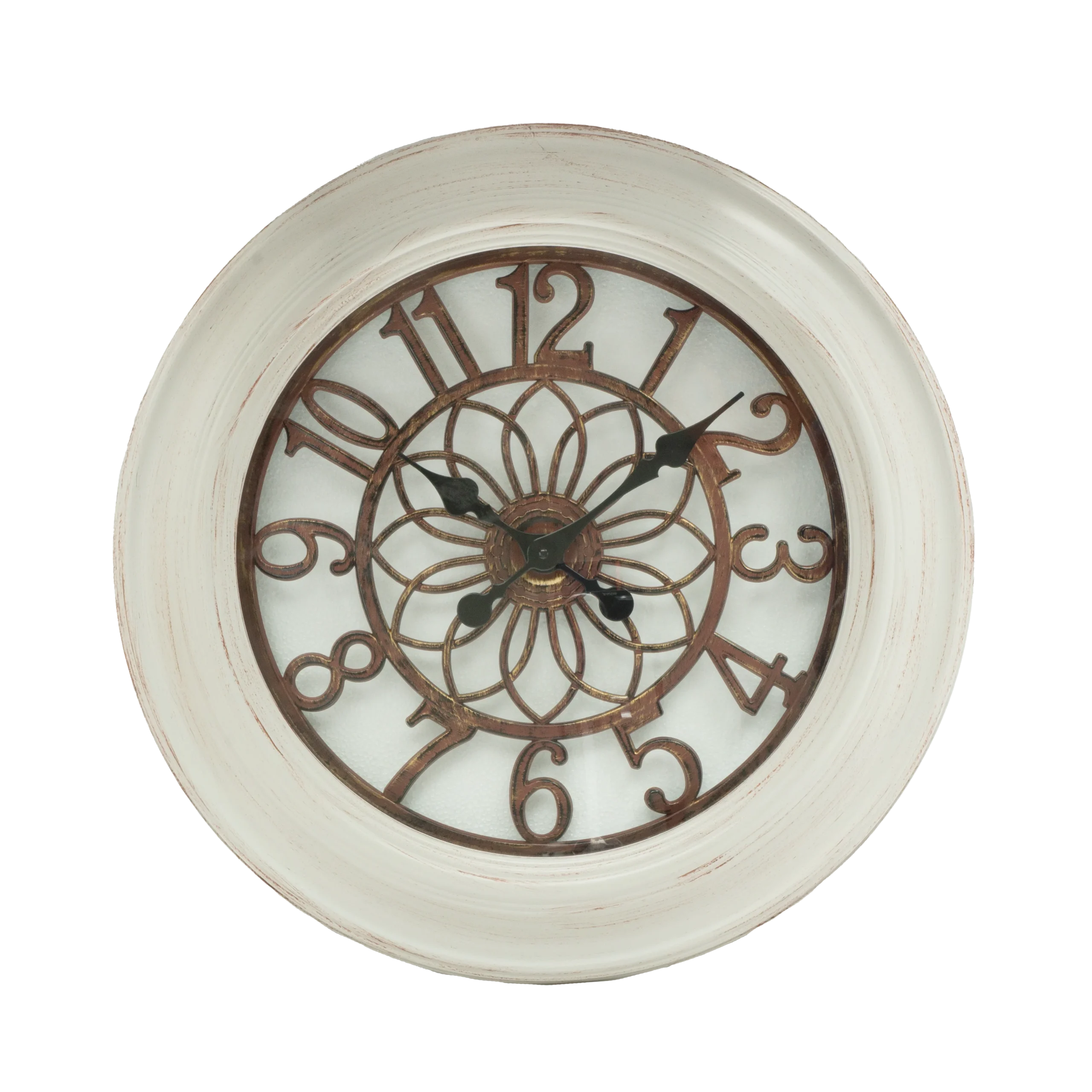 • Números envejecidos y agujas negras sobre esfera blanca