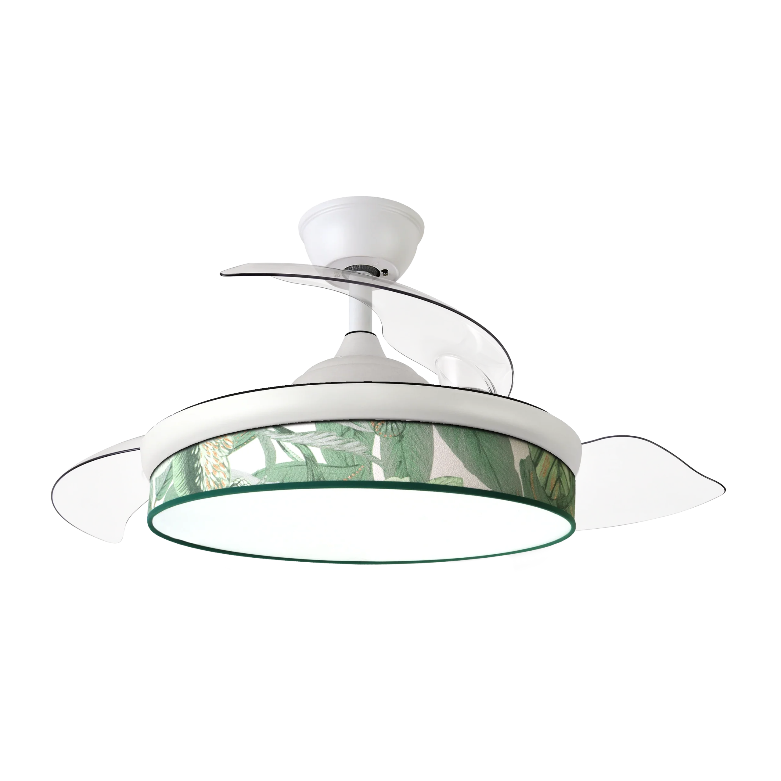 - Aspas Retráctiles de 108 cm: Diseño plegable de ABS en blanco con difusor hoja verde, transforma el ventilador en lámpara discreta, adaptándose a techos de 39-54 cm de altura con tija ajustable.