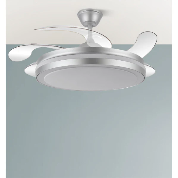 Ventilador DC Esparta Maxi. Este ventilador de techo con aspas retráctiles no solo refresca tu espacio en verano, sino que ilumina con eficiencia en invierno gracias a su tecnología LED integrada de 80W y 10.255 lúmenes. Imagina un hogar cómodo todo el año: brisa suave sin ruido molesto en días calurosos, o luz cálida y natural para noches acogedoras, todo controlado por mando a distancia. Con su diseño plegable, ahorra espacio y se adapta a cualquier decoración, resolviendo el problema de ventilación e iluminación en una sola pieza versátil. Descubre la calidad superior de Abrila, disponible en LUZGURU.