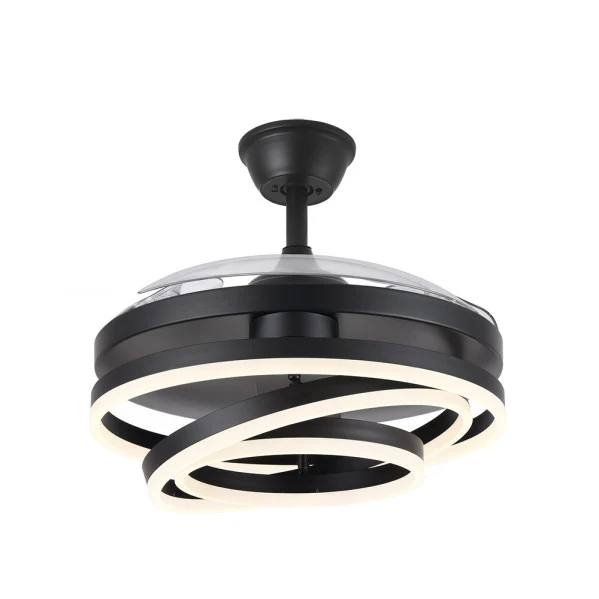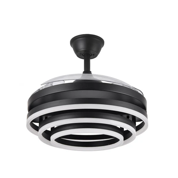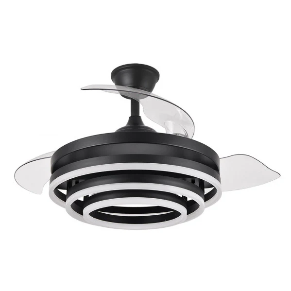 Ventilador de techo aspas retráctiles Kai Negro. Este innovador ventilador DC de Abrila combina ventilación eficiente con iluminación LED integrada, ofreciendo un flujo de aire potente de hasta 9953 m³/h y 6120 lúmenes de luz ajustable en tres temperaturas (3000K cálida, 4000K natural, 6000K fría). Sus aspas plegables de ABS transparente permiten un diseño compacto cuando no se usa, ahorrando espacio y adaptándose a techos de hasta 107 cm de diámetro. Imagina un verano fresco en tu salón sin ruidos molestos (solo 20-45 dB) o un invierno con recirculación de aire cálido, todo controlado por remoto con memoria de color y temporizador. En LUZGURU, descubre la calidad premium de Abrila para un hogar más cómodo y luminoso.