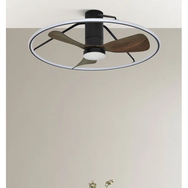 Ventilador de techo con luz LED Oporto de Abrila. Este ventilador DC innovador no solo refresca tu espacio con sus 6 velocidades y control de aire verano-invierno, sino que ilumina con 5600 lúmenes en tres temperaturas (3000K cálida, 4000K natural, 6000K fría), ahorrando energía gracias a su motor eficiente y temporizador. Imagina un hogar cómodo todo el año, con brisa suave en verano y circulación cálida en invierno, sin ruidos molestos (solo 21-32 dB), perfecto para dormitorios o salones modernos. Su diseño futurista en negro y marrón integra luz y ventilación en uno, resolviendo problemas de confort y iluminación. Descubre la calidad de Abrila en LUZGURU, tu tienda de iluminación y ventilación premium.