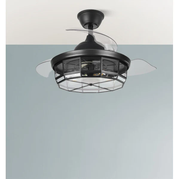 Ventilador de Techo Tornado Negro de Abrila. Este ventilador DC innovador no solo refresca el aire en tus estancias, sino que eleva tu comodidad diaria con su diseño versátil que combina iluminación y ventilación en uno. Imagina veranos más frescos en tu salón o dormitorio, con un flujo de aire potente y silencioso que alcanza hasta 9953 m³/h, eliminando el calor sofocante sin esfuerzo. Sus aspas retráctiles de ABS transparente se despliegan para un diámetro de 107 cm, ofreciendo frescura eficiente y un toque decorativo que se adapta a estilos clásicos o vintage. Con motor DC de bajo consumo (solo 7-32 W) y control remoto, disfruta de 6 velocidades ajustables y modo verano/invierno para un confort todo el año. Disponible en LUZGURU, la calidad premium de Abrila te asegura durabilidad y estilo en cada giro.